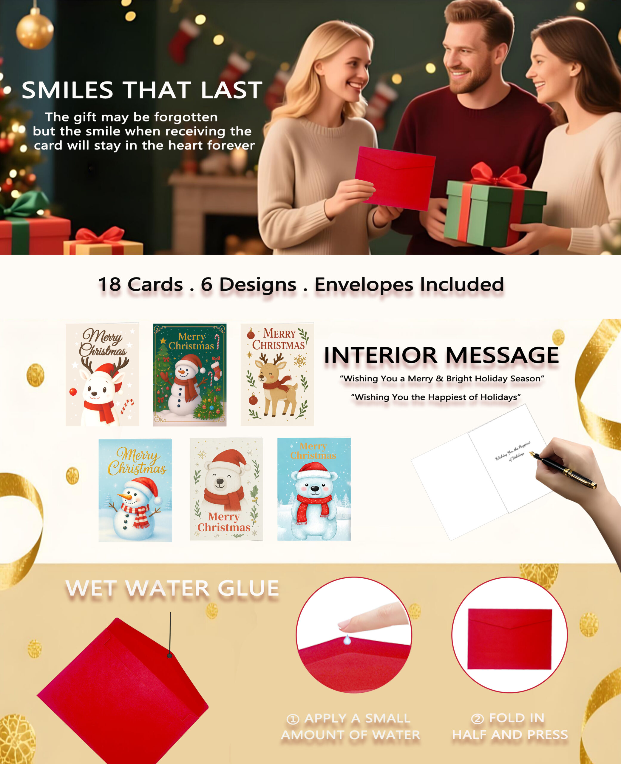 Christmas Cards Set 5×7 – 18 Holiday Greeting Cards with Envelopes 6 Assorted Designs Boxed for Easy Storage Printed Messages Inside